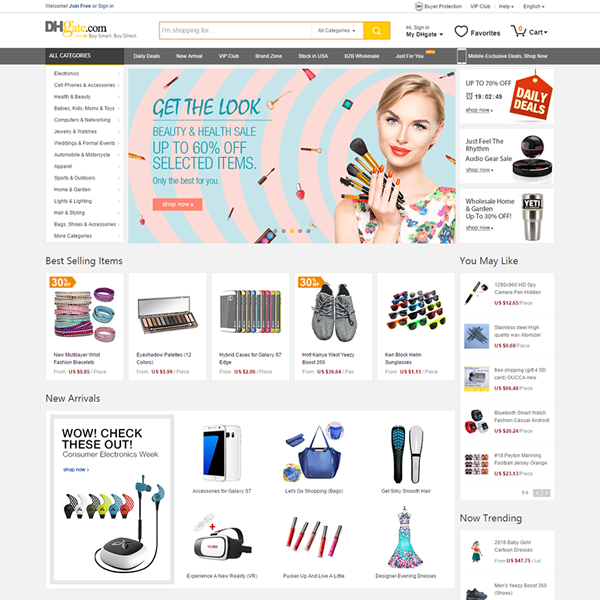 DHgate.com is the world's leading online wholesale marketplace for goods made in China, connecting international buyers with Chinese wholesale sellers who offer the same quality products found elsewhere at a fraction of the price. DHgate hosts over 30 million products in a wide range of categories including Apparel & Accessories, Computers & Networking, Consumer Electronics, Toys & Hobbies, Health & Beauty, Bags & Jewelry, Home, Auto, and more.